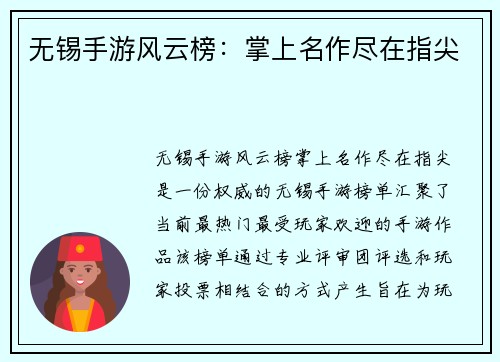 立即咨询《无锡手游风云榜:掌上名作尽在指尖》是一份权威的无锡手游榜单,汇聚了当前最热门、最受玩家欢迎的手游作品。该榜单通过专业评审团评选和玩家投票相结合的方式产生,旨在为玩家提供优质的手游推荐,满足不同玩家的娱乐需求。